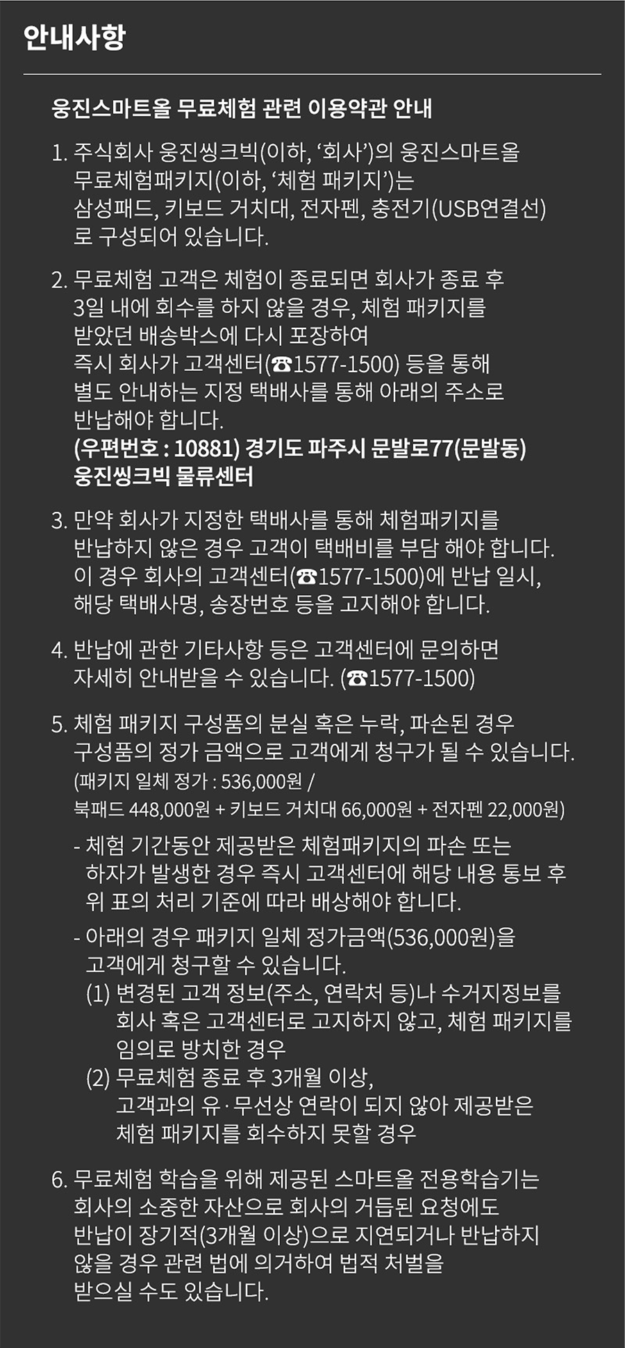5. 무료체험을 위해 제공된 북패드 등은 회사의 소중한 자산으로, 회사의 거듭된 요청에도 반납이 장기적(3개월 이상)으로 지연되거나 반납하지 않을 경우 관련 법률에 의거하여 처벌을 받으실 수 있습니다.